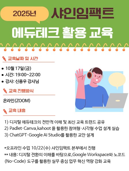 샤인임팩트는 교육 현장의 디지털 전환을 지원하기 위해 '디지털 에듀테크 활용교육'을 진행합니다.