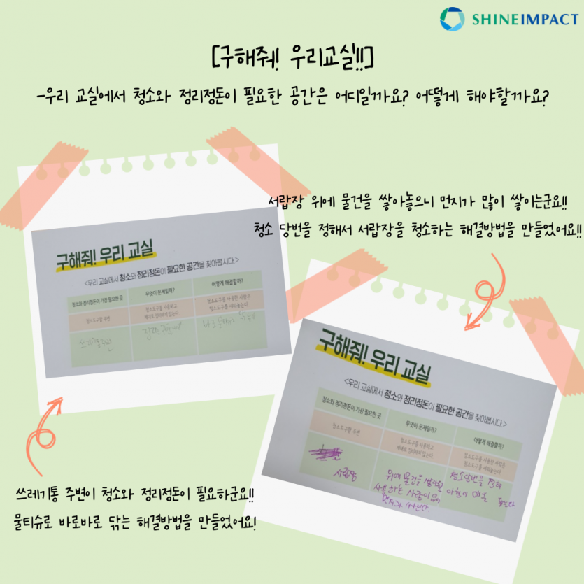 바른청소교실 3단계 리뉴얼 소개^_^ 작성자운영진 작성일2021.05.26 조회3,679 본문 바른청소교실 3단계 수업이 리뉴얼되었습니다! 바른청소교실 3단계(5-6학년)시간 세부내용 온라인 40분오프라인 90분 -청소 이야기를 숫자로 알아봐요-환기 실험을 통해 환기의 중요성을 알아봐요-나의 사물함과 책상 속을 정리 정돈해요-1110 청소습관으로 학교와 집에서 실천할 청소 계획을 세워요 리뉴얼된 바른청소교실로 활발하게 수업이 진행되고 있습니다!온라인, 오프라인으로 많이 많이 신청해주세요! 이전글 목록 다음글